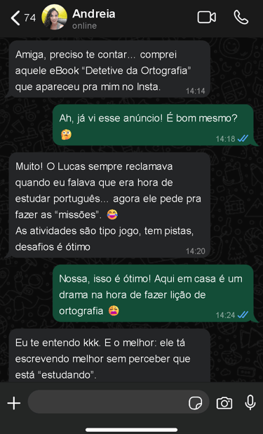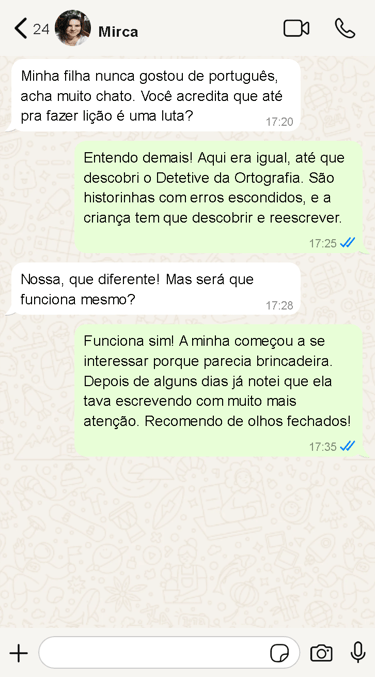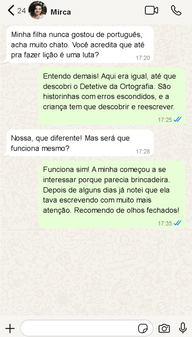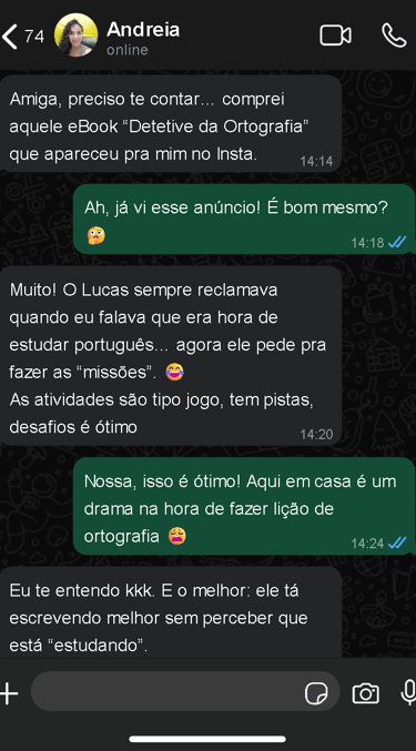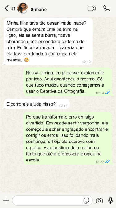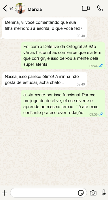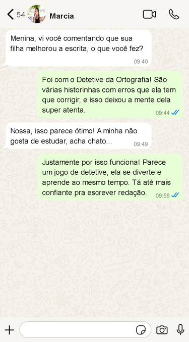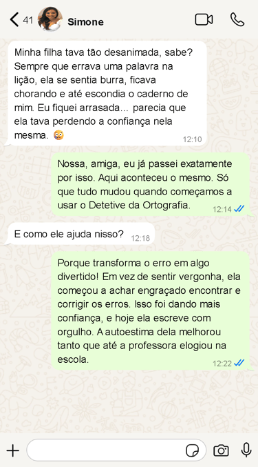 A escola vivia chamando atenção para os erros de escrita da minha filha. Hoje, com o Detetive da Ortografia, ela recebe elogios da professora e adora mostrar os avanços.
