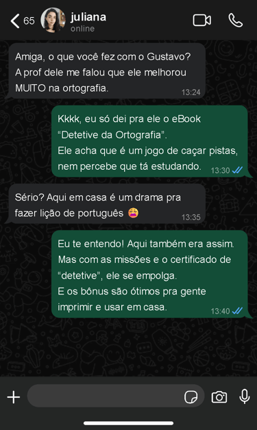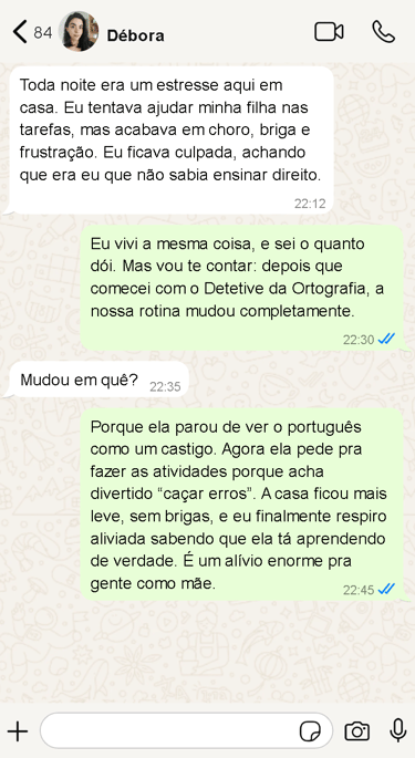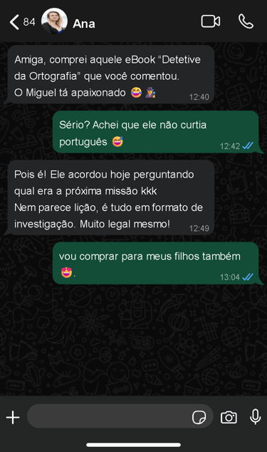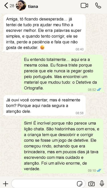 "Antes, meu filho detestava escrever. Qualquer tarefa virava choro e frustração. Depois que começamos com o Detetive da Ortografia, ele passou a pedir para fazer as atividades, corrigir os próprios erros e se orgulhar de escrever certo. É incrível ver a confiança dele crescer."
