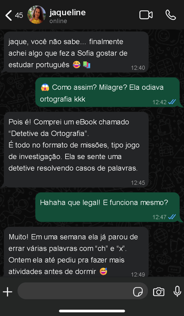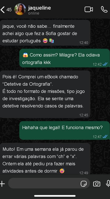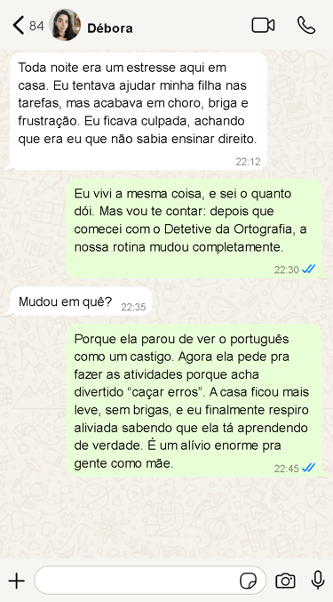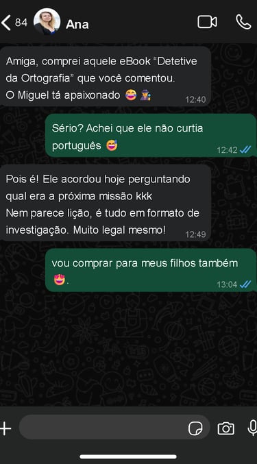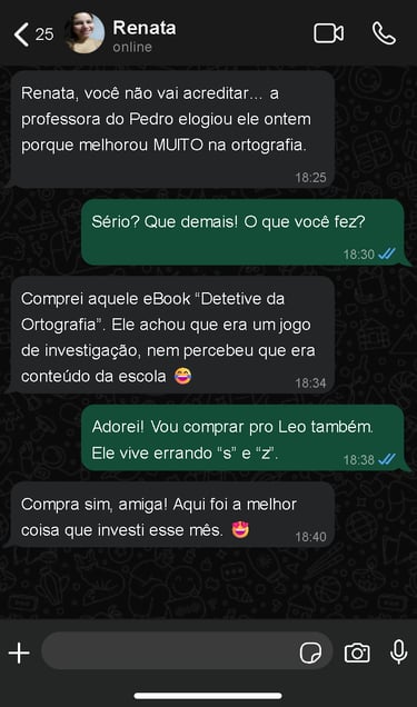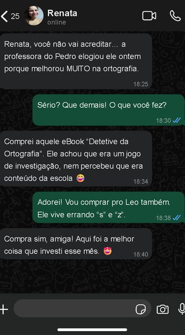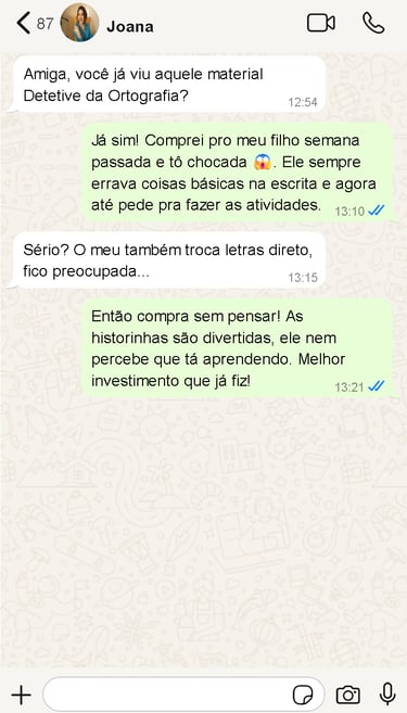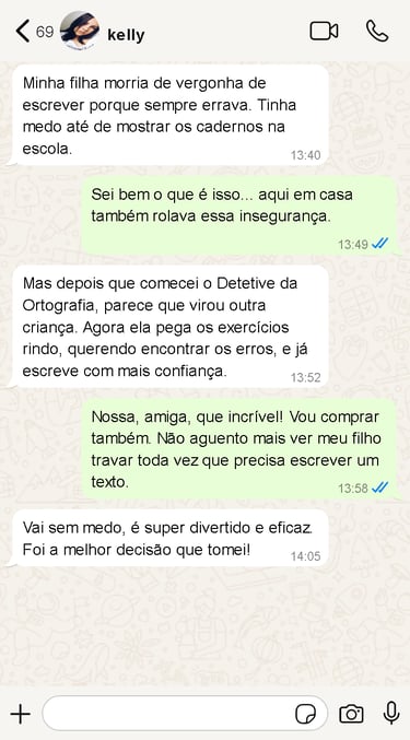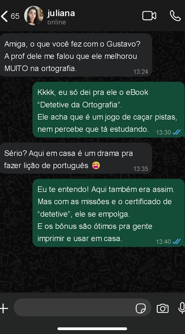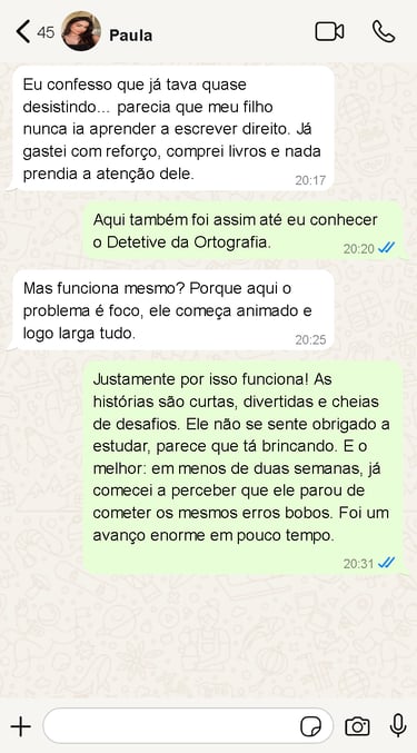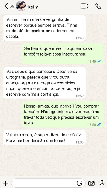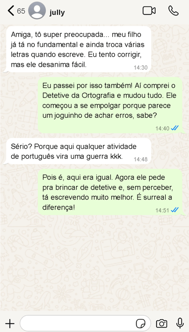 Meu filho sempre confundia letras e ficava inseguro. Depois do Detetive da Ortografia, ele começou a escrever com muito mais confiança e até corrigir sozinho os próprios erros. Mudou totalmente!